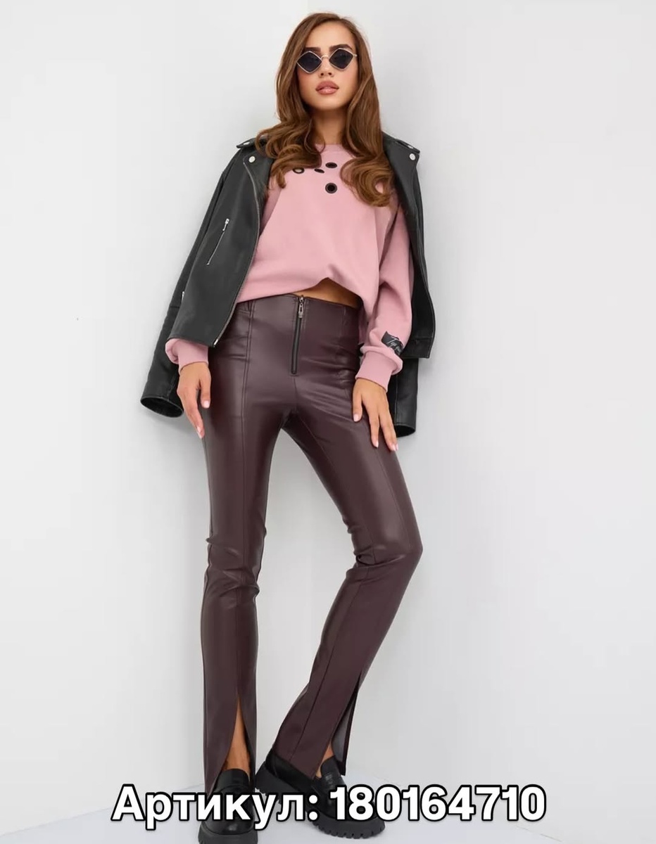 Что это: зауженные брюки из плотной эко-кожи с высокой посадкой, акцентной молнией по центру и вертикальными разрезами у щиколотки. Цвет — глубокий какао.