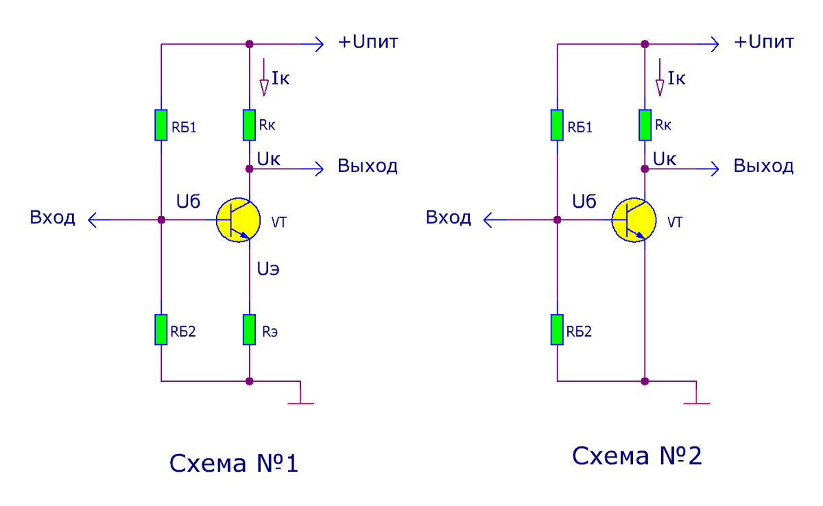 В этих схемах количество элементов сведено к минимуму, а смещение рабочей точки транзистора в рабочую область задается не с помощью делителя напряжения, а установкой определенного тока базы, с помощью резистора RБ. Сразу скажу, что такой способ задания рабочей точки транзистора не очень хорош. Особенно для транзисторов с большим значением коэффициента усиления h21э. Расчеты нужно вести, привязываясь к h21э, который есть величина нестабильная, он сильно зависит от температуры и тока коллектора. Перед началом расчетов нужно знать его точное значение на необходимом для нас токе коллектора, что неудобно, да и два разных измерителя h21э покажут нам разные, порой довольно сильно отличающиеся значения.