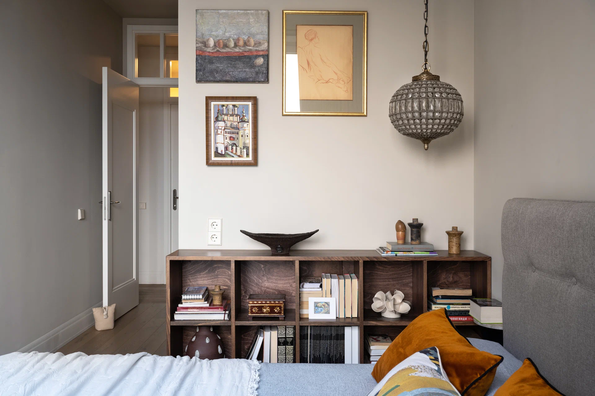 В нашей с мужем спальне вместо тумб — лёгкие навесные полки. И если честно, это решение со временем показалось не самым удачным: там помещается максимум одна книга, и всё.