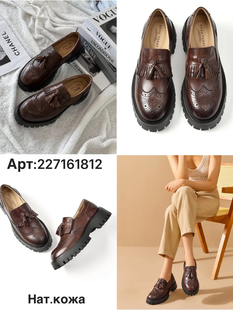 Эта мини-капсула — про «ту самую» базу, которая работает круглый год: благородные коричневые оттенки, качественная натуральная кожа, утолщённые рельефные подошвы и аккуратные детали. Разбираем каждую пару по фото и строго по артикулам — с нюансами посадки, сочетаний и уходом. Артикул: 227161812 Что видим на фото Гладкая натуральная кожа благородного шоколадного тона, классический перфорационный узор wingtip на мысе, язычок с бахромой и кисточками. Подошва — массивная, «тракторная», с выраженным протектором и чуть выступающим рантом. Нос округло-квадратный: выглядит современно, но остаётся комфортным. Ключевые плюсы Как сидят Средняя полнота, жёсткий задник фиксирует пятку, носок просторный — комфорт и на целый день. На высокый подъём берите на полразмера больше, чтобы бахрома не «заламывалась». С чем носить Совет стилиста Поддержите коричневый цвет аксессуаром: ремень в тон ранту или мини-сумка хобо. Носки — плотные, графитовые или «молоко»: видно, что продумано. Артикул: 204100227