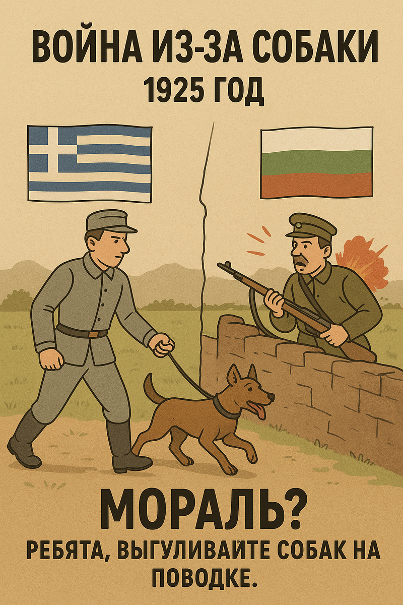 Короче, история такая. Греция и Болгария сидели тихо, мирно, как два соседа в общаге. Но тут случилась дичь. Греческий солдат пошёл выгуливать пса у границы. Пёс, понятное дело, был нормальный пацан: увидел что-то интересное на болгарской стороне и побежал. Ну а хозяин — настоящий мужик: «Как это так? Моя собака в чужой стране? Сейчас верну!» И полез за ним. А дальше — кино. Болгарские пограничники смотрят: «Ага! Вторжение!» и БАХ! Солдат готов. Греки такие: «Вы чё, офигели? Нашего парня грохнули из-за собаки!» И начинают мобилизацию. Войска на границу, пушки, танков, правда, нет, но зато злость как у соседа, которому поцарапали Ладу. Три дня стреляли, реально люди гибли! А всё из-за того, что пёс не знал, где заканчивается Греция и начинается Болгария. Ребята, выгуливайте собак на поводке.