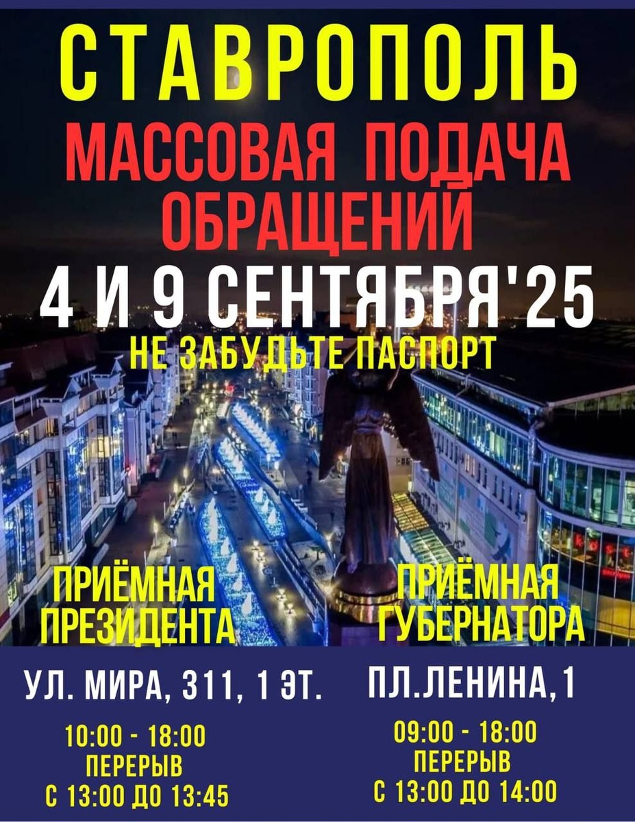🔴🔴🔴СТАВРОПОЛЬ!!! ВАЖНЕЙШАЯ ИНФОРМАЦИЯ!!! ПОДАЧА ОБРАЩЕНИЙ В ПРИЁМНУЮ ПРЕЗИДЕНТА ОФ-ЛАЙН!!! Ставрополь, где животных заживо сжигают в отловах, жестокость обывателей к собакам и кошкам уже просто зашкаливает, а на улицах устраивают показательные казни бездомных животных с пытками, выходит на подачу обращений Президенту и Губернатору против этого беспредела. Юристами подготовлены обращения, которые готовы к применению как для коллективных обращений так и для индивидуальных. Также подать обращение можно и в электронном виде (скан или пдф копии) pppskfo@gov.ru 🟠4 сентября и 9 сентября 2025г.! 🔴СОСТОИТСЯ ПОДАЧА ОБРАЩЕНИЙ В ПРИЁМНУЮ ПРЕЗИДЕНТА : 🟠СТАВРОПОЛЬ, ул. Мира 311, 1-й этаж с 10:00 до 18:00 (перерыв на обед с 13:00 до 13:45) 🔴И В ПРИЕМНУЮ ГУБЕРНАТОРА : 🟠СТАВРОПОЛЬ пл. Ленина 1 с 09:00 до 18:00 (перерыв на обед с 13:00 до 14:00) 🟠Не забудьте взять паспорт! 🟠Будьте предельно вежливы! 🟠Нужен каждый! Каждый голос важен! 🟠Нас должно быть много, чем больше, тем мы