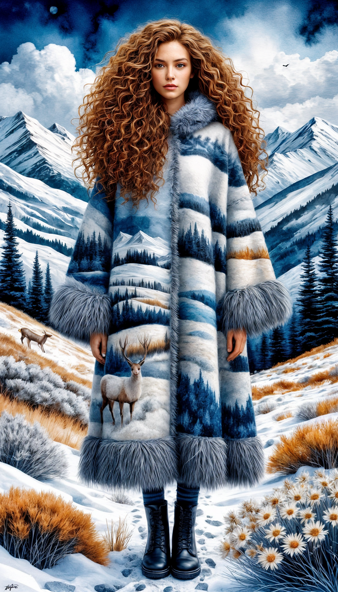 Привет, друзья! Тройная экспозиция, печворк, 3д рельеф, поделка из меха норки, тафтинг арт, стринг-арт, белое на белом, проекция пейзаж на длинном широком пончо девушка с длинными вьющимися волосами в полный рост, на прозрачном пальто белый пейзаж, внутри пальто тундра, белые олени, снег, юрты, эдельвейс, сухоцветы, молочные белые цвета, меховой, пуховый, шерсть, искусства фэнтези, сюрреализм, голубой, белый P.S. Приглашение на Мастер-Классы по изучению Топовых Нейросетей, где Вас ждут Бонусы и Подарки: <<<Участвовать Бесплатно>>>