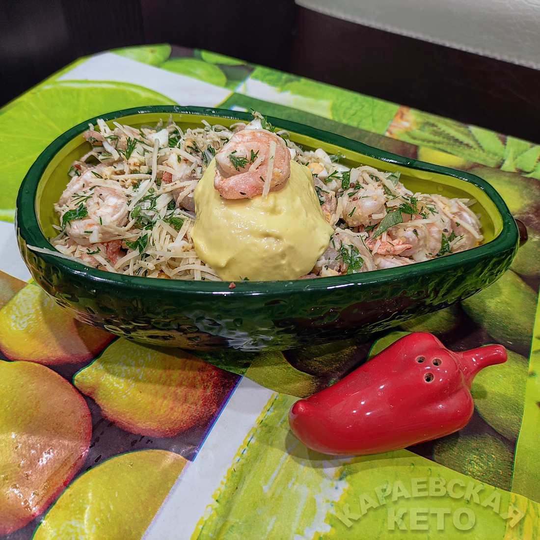Майонез домашний или оливковый или на масле из авокадо К креветкам добавить нарезанные кубиком яйца, сыр на мелкой терке, зелень. Посолить, поперчить и заправить майонезом. От Елены Караевской