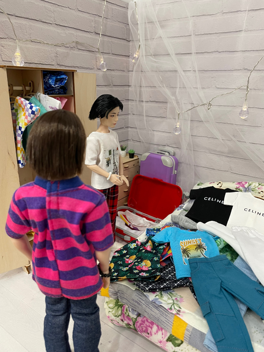 Чонгук вернулся из спортзала и был в предвкушении отдыха: поваляться на кровати, посмотреть видео из интернета. Но войдя в комнату, увидел такую картину: Кровати не было видно- везде лежала одежда, можно хоть прямо сейчас модный бутик открывать. Среди этого хаоса суетился Тэхён. Так он собирался ехать на море. Чонгук кашлянул, пытаясь привлечь внимание. Тэхён, увидев младшего, просиял: -Чонгуки, как хорошо, что ты пришёл!! Мне помощь нужна! Какую брать- эту или эту? -Хён, они же почти одинаковые … -Вот я думаю, что надо обе взять! -Тэхёни-хён, зачем тебе столько одежды? Мы же всего на две недели едем. А ты как будто переезжать собрался.. -Ты не понимаешь! Не могу же я ходить в одном и том же и на всех фотках быть в одинаковой одежде! Младший вздохнул- если едешь в отпуск с модником, то надо смириться. -Хён, с таким перевесом нас не пустят в самолёт! Может всё же более рационально будешь вещи собирать? -Я попробую! Ну вот смотри: какие штаны взять? Белые или серые? Белые наряднее, но мо