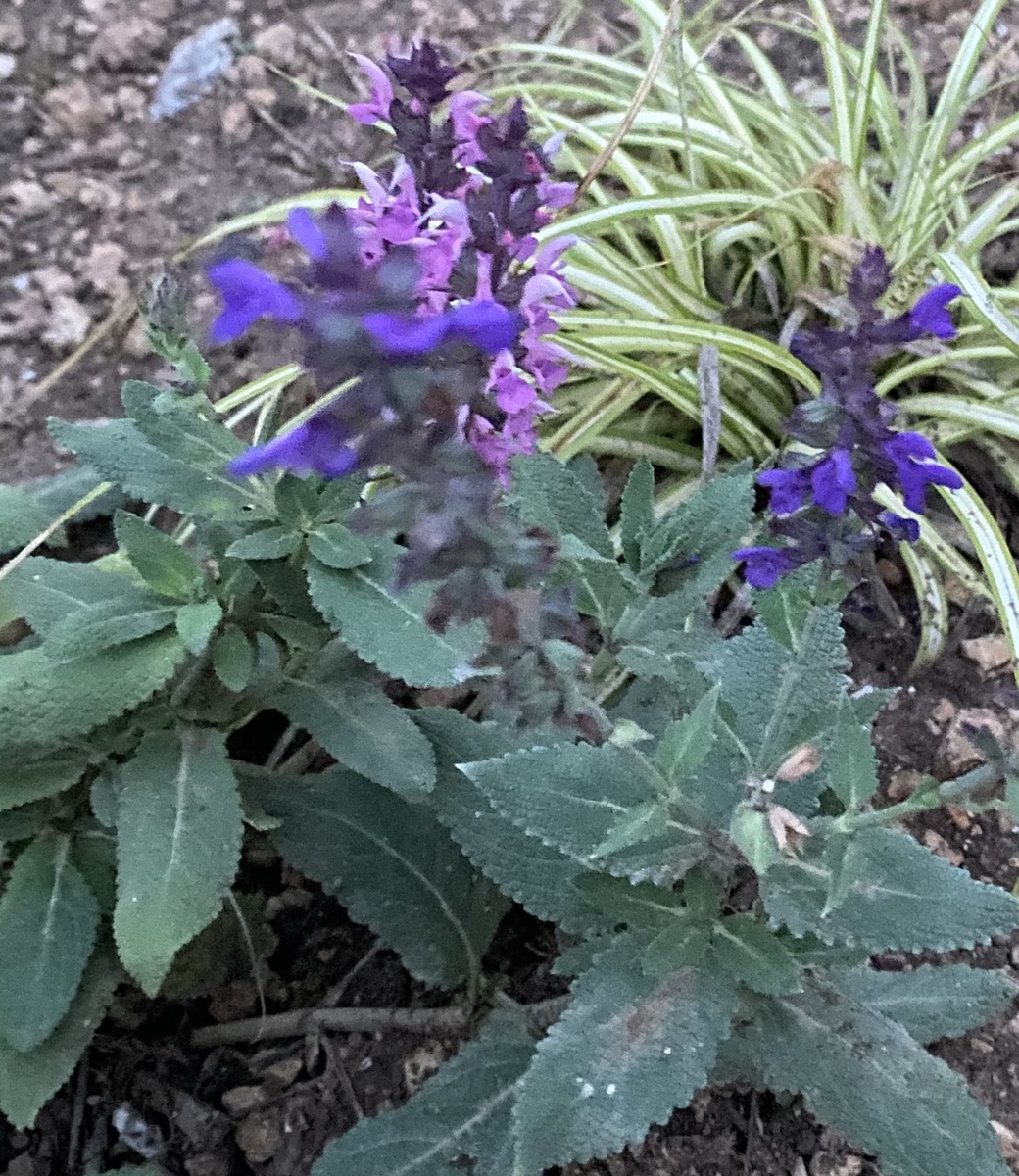 03.09.25 что-то непонятное. Внутри повторно цветущей Карадонны несколько веток расцвели другим цветом. Это уже третье цветение этого лета, совсем не про пышность. Но шалфею засуха не страшна. И он, знай себе, нарастает. Версия следующая. Предположу, что в горшок P9 случайно попал отросток с другого саженца. Саженец Карадонны я покупала в прошлом году в частном мини-питомнике в Балаклаве. Названия у питомника пока нет. Нашла онлайн по местоположению. Сходила и купила. Так ведь прошлым летом, во время цветения ничего подобного не было. И нынешним тоже. Да и покупала я её практически одной веточкой в горшочке. В этом году, в июне, во время основного цветения, все было как обычно. Июнь 25, более высокий шалфей – Карадонна. Поменьше – Рианна. И отцветал симпатично, без фокусов. Не знаю, что и думать. Одно точно – в саду не скучно.)) Всем как можно более понятной садовой практики.