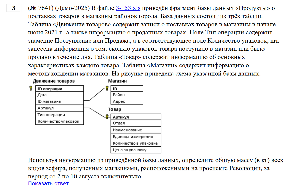 Задача с сайта Полякова Демоверсия 2025 скачиваем файл открываем правый верхний угол окна программы - разрешить редактирование внизу мы видим три вкладки нужно каждую подготовить к решению на каждой вкладке кликаете левой кнопкой мыши на ячейке A1, и в правом верхнем углу выбираете сортировка и фильтр - фильтр в нижней правой части ячеек первой строки появится кнопка вызова контекстного меню фильтрации так делаем с каждой вкладкой подготовка к решению закончена далее читаем внимательно условие задачи "определите общую массу (в кг) всех видов зефира, полученных магазинами, расположенными на проспекте Революции, за период со 2 по 10 августа включительно" разбиваем мысленно условие на несколько пунктов по очереди все фильтры делаем теперь все полученные данные собираем на одной вкладке, где можно получить ответ на главный вопрос: общая масса в килограммах всех видов зефира в адресе находим два ID магазинов, вносим эти данные в первую вкладку 10 и 15 магазины далее выписываем на черновик а