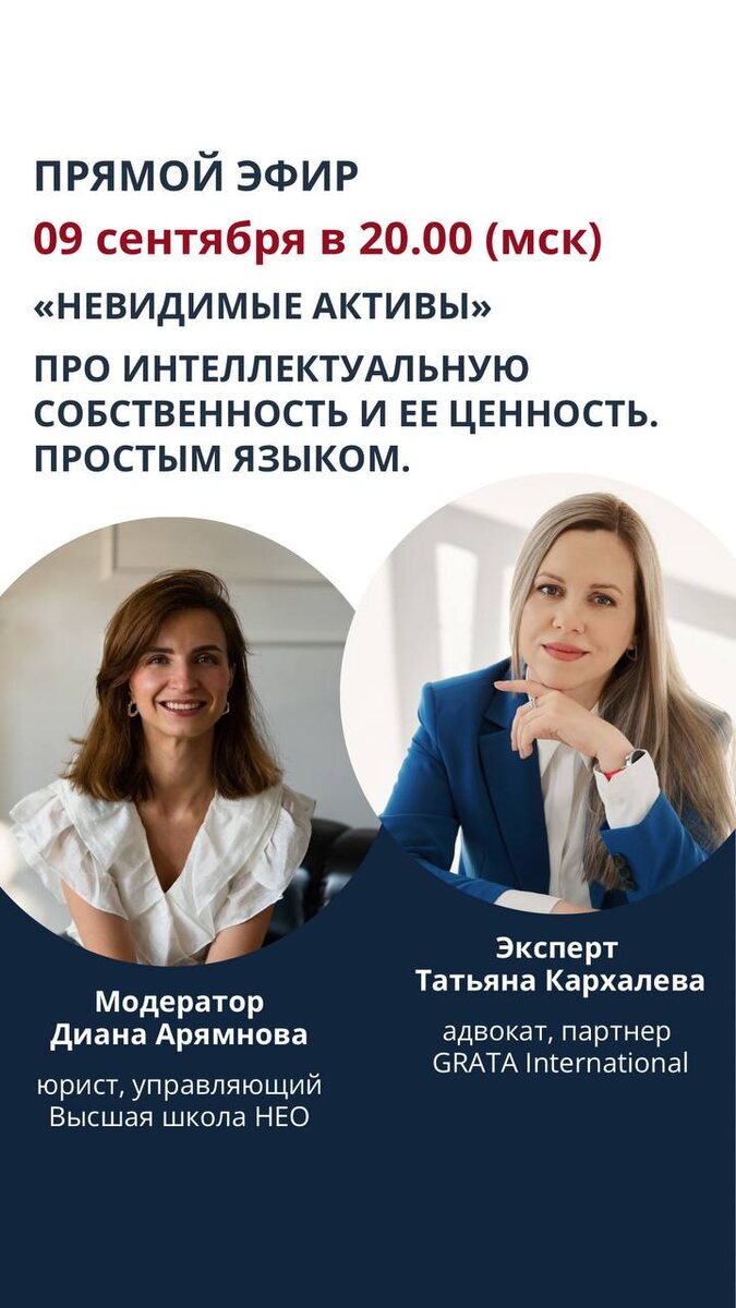 ‼️‼️‼️ Невидимые активы Нужны еще практические советы по управлению интеллектуальной собственностью для предпринимателей? А если это еще и на стыке с семейным правом? Точно да! Анонсирую полезный эфир с топовым специалистом по семейному праву, консультанту по имущественному планированию, медиатору, управляющим Высшей школой НЕО, автором телеграм-канала «Не сошлись характерами» Дианой Арямновой. ✔️Эта встреча для тех, кто трудится над своим делом. ✔️Для всех, кто генерит идеи, вкладывается в продукт, создает сайты и растит социальные сети. ✔️Для всех, кто думает про повышение узнаваемости бренда, рисует логотипы и придумывает слоганы. ✔️Для всех, кто улучшает производственные процессы или оказывает консультационные услуги по защите интеллектуальной собственности! 🗓️ 09 сентября в 20:00 (мск). Договорились вместе с Дианой обсудить: 📍что такое интеллектуальная собственность; 📍как интеллектуальная собственность помогает сохранить бизнесу уникальность; 📍разобрать, как предпринимат