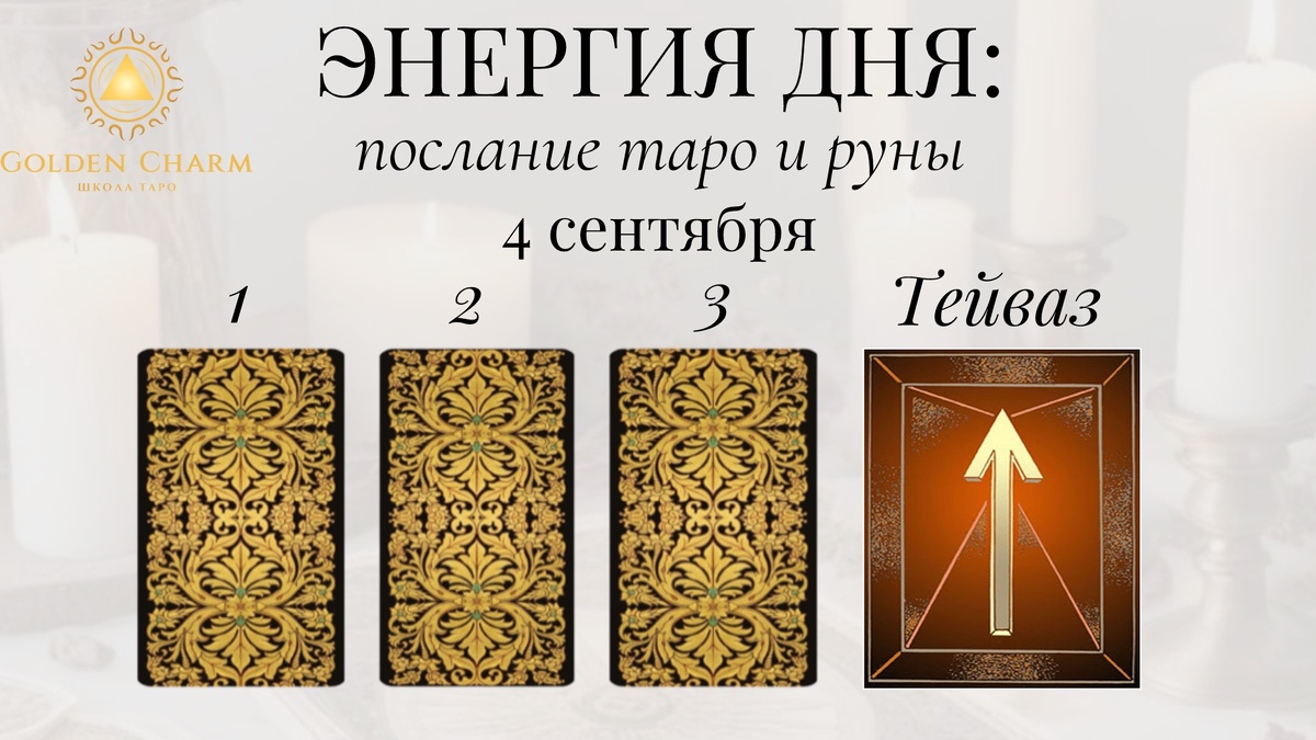 Заказать личный расклад тут✅ Прогноз на 4 сентября: что тебя ждёт Приходи на обучение Таро ✅ Выбери карту — 1, 2 или 3 — и узнай, какой путь для тебя: 1. Мир Время завершения циклов и начала новых этапов. Готовься к переменам, ощущению свободы и гармонии. Сегодняшний день благоприятствует принятию важных решений и отпусканию старого. 2. Суд Это время пробуждения и переоценки ценностей. Возможно осознание своего истинного пути и внутренней силы. День подходит для глубоких размышлений и принятия судьбоносных решений. 3. Жрица Наступил период интуитивного познания и внутреннего роста. Прислушайся к своей интуиции, доверяй внутренним подсказкам. Это время духовного развития и открытия тайн. Руна дня — Тейваз Символизирует решительность, мужество и достижение целей. Действуй уверенно, проявляй инициативу. Этот день предназначен для преодоления препятствий и достижения успеха. Напиши цифру карты + ТЕЙВАЗ в комментариях, чтобы активировать энергию. Хочешь личный расклад? Пи
