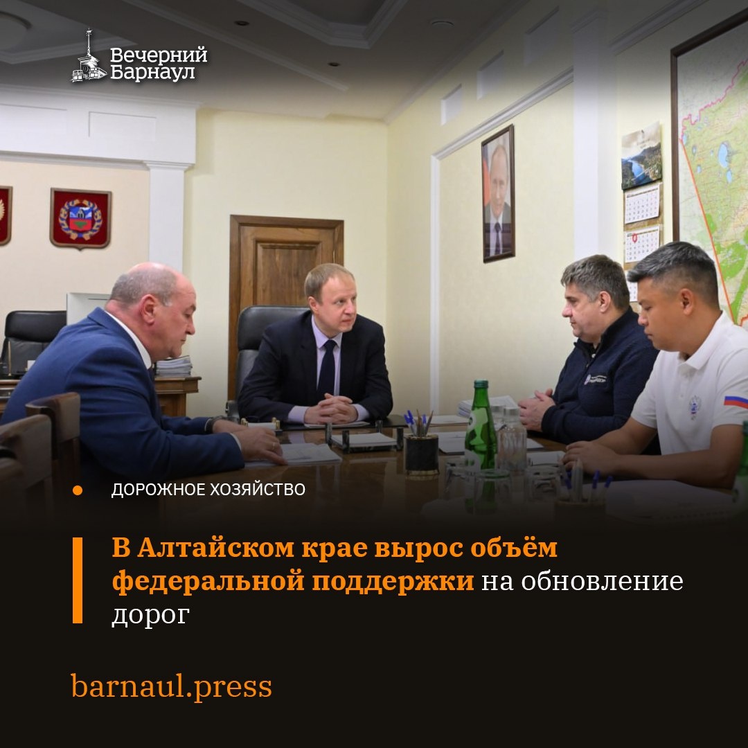 Губернатор Алтайского края Виктор Томенко встретился с руководителем Федерального дорожного агентства Романом Новиковым. Глава региона отметил, что объём федеральной поддержки значительно увеличился, в прошлом году он составлял 1,7 миллиарда рублей, а в этом — 7,9 миллиарда. 📌 По его словам, в 2025 году обновят 900 километров алтайских дорог, в том числе более 500 километров в рамках нацпроекта «Инфраструктура для жизни». Фото: t.me/tomenko_22 @barnaul