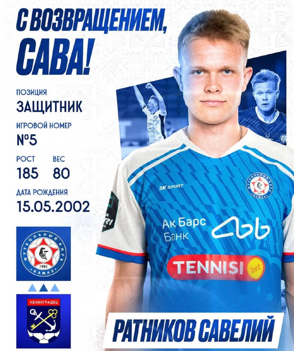 🚨 Защитник Савелий Ратников пополнил состав футбольного клуба «КАМАЗ».