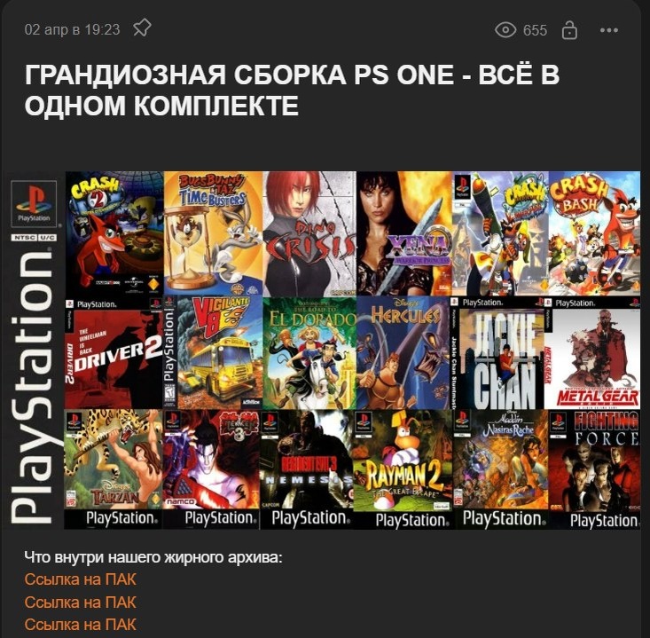 🎮Обновил нашу грандиозную сборку по PlayStation One🎮 💥Оставил в папке с эмулятором и текстурами только самое необходимое и убрал ReShade из-за него возникало много дополнительных вопросов. Я решил не менять оригинальную цветность игр и перезагрузил вам эмулятор, чтобы всё работало как часы. Наша сборка: https://vk.com/wall-87467113_118898 💯Эмулятор ✅Все файлы и исправления к нему ✅Все настройки ✅Полный архив игр на 800 гб ( КАЧАТЬ ВСЕ СРАЗУ НЕ НУЖНО, ОТКРЫВАЕТЕ И ИЩИТЕ НУЖНОЕ ) Демонстрационное видео так же есть в посте, можете сами убедиться в качестве настроек. Гайд по изменению настроек и использованию эмулятора: https://vk.cc/cPcTC8 Dailyhardcore Подписаться