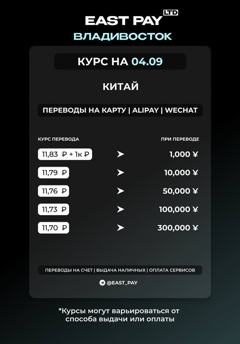 КУРСЫ НА КИТАЙ 💙Переводы на китайскую карту 💙Alipay / Wechat 🔘В течение дня курс может меняться. Рекомендуем уточнять актуальный курс у менеджера. ❗️ВАЖНО: мы получили лицензию и открыли офис в Корее. Подробности можете узнать у менеджера. 🔴🔴🔴🔴🔴🔴🔴🔴🔴🔴 🟠Написать менеджеру: @east_pay_world 🟠Сделать просчет самостоятельно в боте: @East_PaySer_bot ✈️ Подписаться на «East Pay»