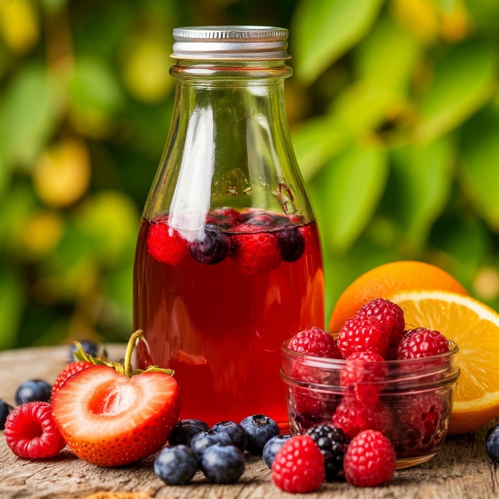 Это вкусный и полезный ферментированный напиток, который сочетает в себе традиционный вкус комбучи с природной сладостью и ароматом ягод. Основной рецепт Подготовьте базовую комбучу через первичную ферментацию. Выберите подходящие ягоды (клубника, малина, ежевика, черника, смородина). Добавьте ягоды в пропорциях 1-3 столовые ложки на 1 литр комбучи. Оставьте на вторичную ферментацию на 2-3 дня при комнатной температуре. Охладите в холодильнике перед употреблением. Как определить готовность Напиток должен быть слегка кислым на вкус. Цвет должен сохраняться за счет добавленных ягод. На поверхности может образоваться небольшой сгусток — это нормально, это начало формирования нового чайного гриба. Рекомендуемые виды ягод 1. Клубника Используйте свежую или замороженную. Размораживайте замороженную перед добавлением. Нарежьте на небольшие кусочки. 2. Черника Обладает антиоксидантными свойствами. Хорошо сочетается с другими ягодами. Используйте свежую или сушеную. 3. Клюква Придаёт приятную к
