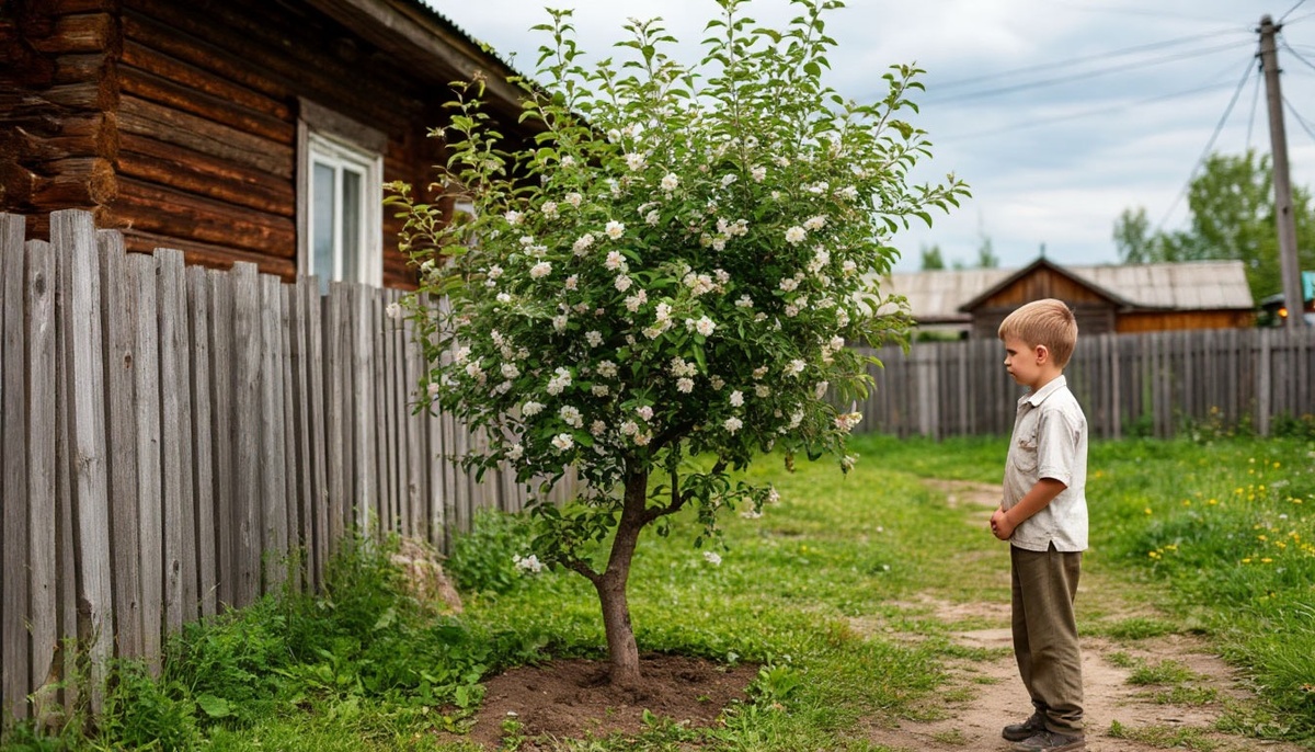 Стёпка бережно опустил саженец в яму, а отец стал засыпать корешки землёй, утрамбовывая её большими, привыкшими к труду руками. Полили из ведра. Вода жадно впитывалась, оставляя тёмный узор.