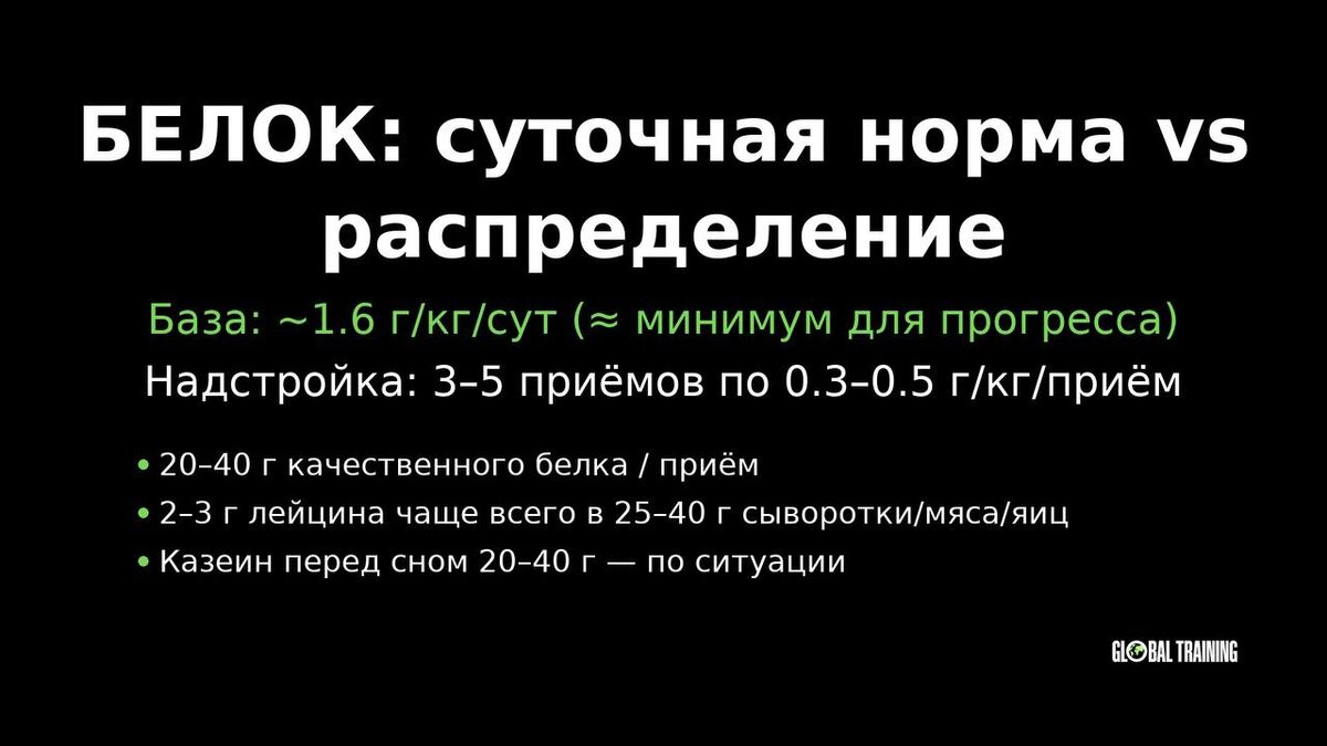 белок: правила приема • Суточная норма белка — база. При силовых тренингах оптимум для большинства ≈ 1.6 - 2,2 г/кг/сут, более высокие дозы дают всё меньшую отдачу • Равномерное распределение по 3–5 приёмам может усилить ответы MPS (синтез мышечного белка), но эффект на состав тела меньше, чем от общей нормы (особенно у молодых при достаточном белке) • Практически: цель ≈ 1.6 г/кг/сут; делим на 3–5 приёмов по 0.3–0.5 г/кг/приём (обычно 20–40 г белка) Почему суточная норма — главный фактор Метанализы показывают, что при силовых тренировках повышение потребления белка улучшает прирост силы/FFM до ~1.6 г/кг/сут, а сверх этого порога отдача снижается. Для части задач/нижней части тела может потребоваться ≥1.6 г/кг/сут. Про «лейциновый триггер» (постараюсь кратко и понятно) Лейцин действительно важен как сигнал для mTOR, но «жёсткого порога» одинакового для всех нет; у пожилых зависимость выражена сильнее, у молодых — данные разнонаправленные. В целом 25–40 г качественного белка обыч