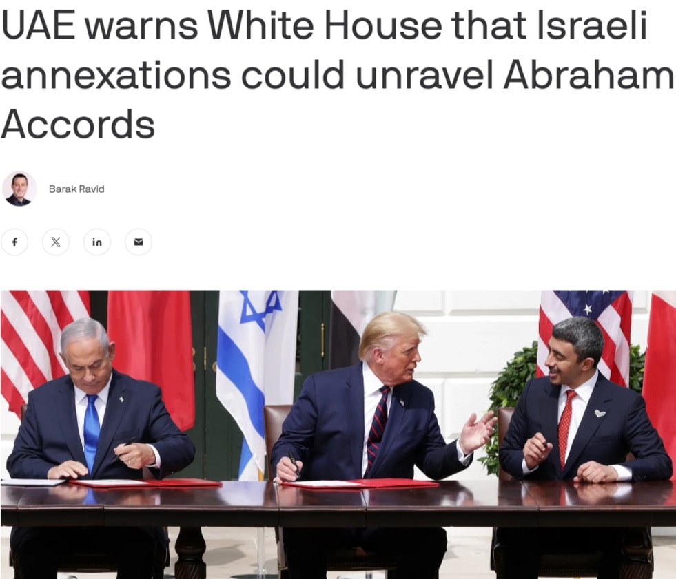 UAE has WARNED Trump administration against ISRAELI ANNEXATION of West Bank – Axios Adds that it will DAMAGE Abraham Accords & threaten efforts to extend them First Arab country to condemn Oct 7, has maintained relations with Israel since then Now made clear annexation of West Bank as ‘RED LINE’