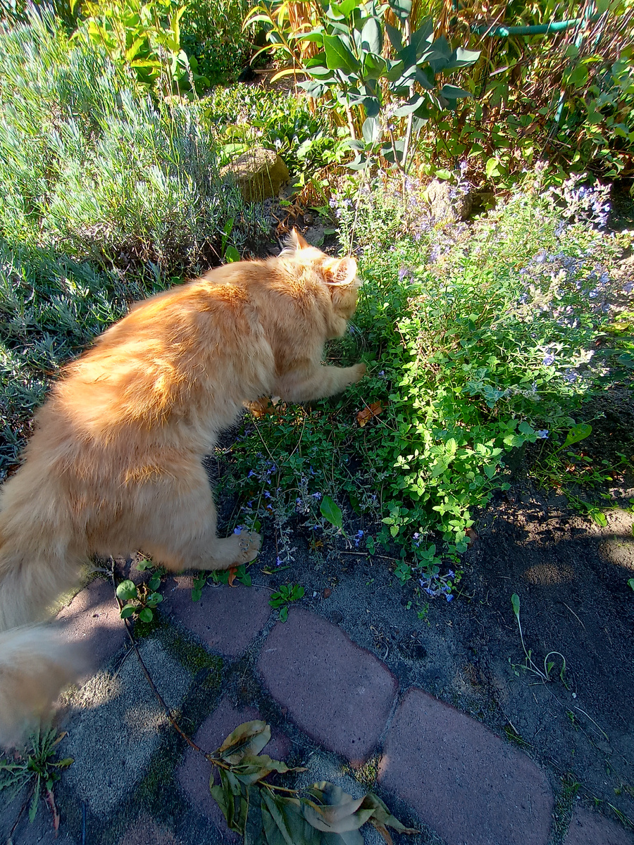 Знаете такое растение : котовник? Миленький травянистый кустарничек .Цветет голубыми цветочками. Должен напоминать лаванду😊. Может и напоминает,но не нашему молодому котику. Рыжуня оочень хорошо отличает котовник от лаванды😂 . Мимо лаванды он пройдет даже и не глядя в ее сторону. А вот КОТовник -это страсть!!! Понюхает, покусает, пожует, а сколько нежности к растению 😂. Трётся всем Рыжуней об котовник! Что зимой будет делать? Будем сушить травку!Зря что-ли растение КОТовником назвали!?