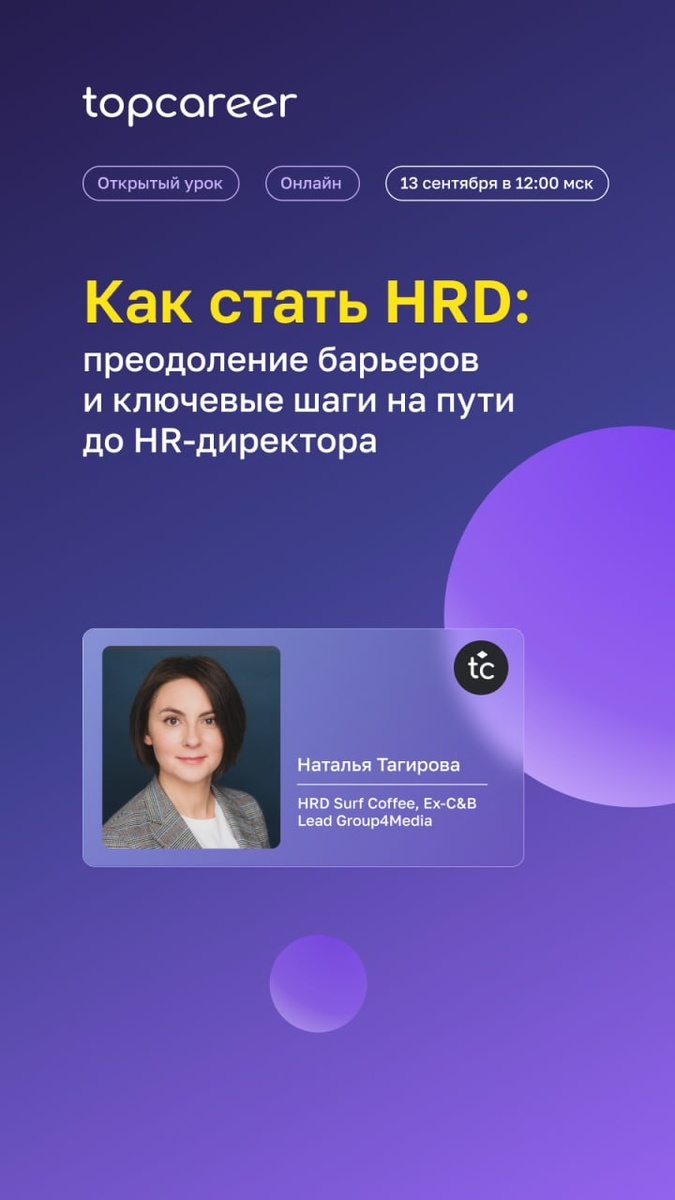 Переход в роль HRD — это не просто новый тайтл, а переход на стратегический уровень влияния. Именно от HR-директора бизнес ждет решений, которые помогают расти: как управлять изменениями, перестроить оргструктуру, удержать ключевых людей, создать культуру, которая работает на результат. Но чтобы дойти до этой позиции, недостаточно просто быть хорошим специалистом — важно понимать зону ответственности, развивать нужные компетенции и уметь использовать возможности, которые открывают перемены. ➡️ На открытом уроке «Как стать HRD: преодоление барьеров и ключевые шаги на пути до HR-директора» мы поговорим о том, как пройти путь до HRD, что помогает вырасти и как строить стратегическое HR уже сегодня. 🕰 Когда: 13 сентября в 12:00 мск 💭 Спикер урока: Наталья Тагирова, Ex-HRD Mediasystem О Наталье: ✨Более 20 лет в HR (международные и российские компании в медиа и авто отраслях, численность — от 250 до 1500), с 2015 года — в роли HRD. ✨Опыт работы в разных HR направлениях (C&B, T&D, рек
