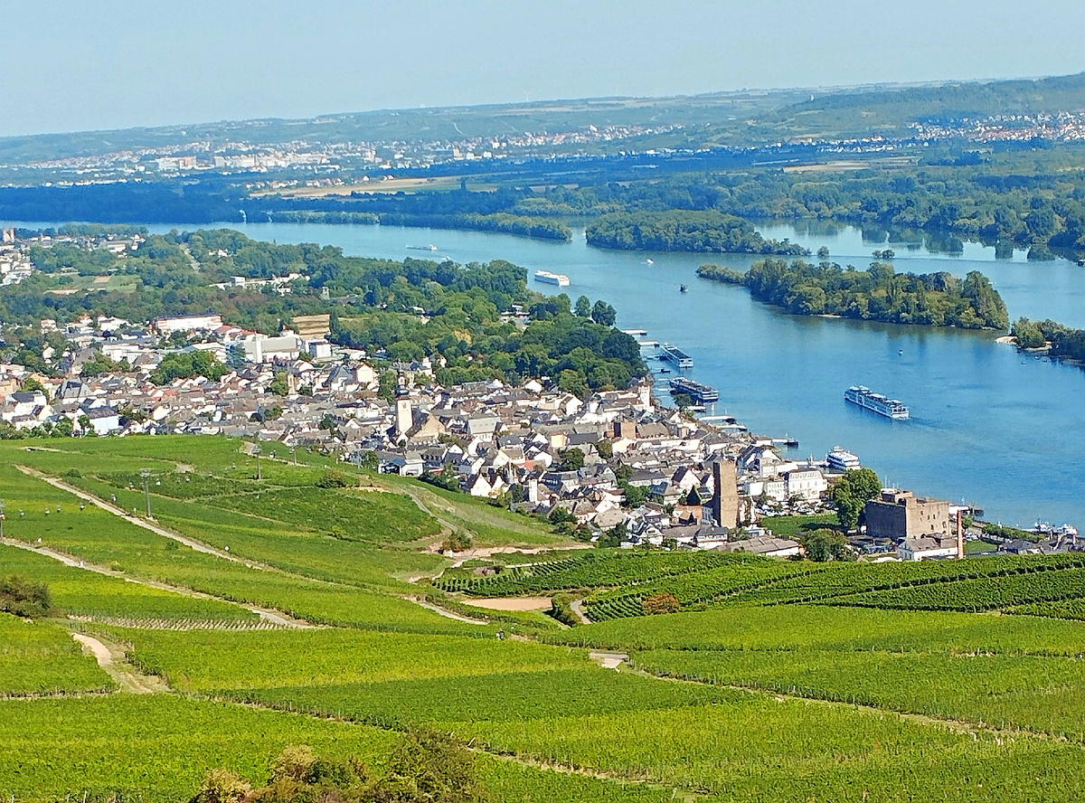 Затем по горной дороге мы последовали в Рюдесхайм-на-Рейне, заехав предварительно к огромному, 38-ми метровому монументу Нидервальд, расположенному на горе, откуда открывается панорама на реку, виноградные террасы и симпатичный городок.