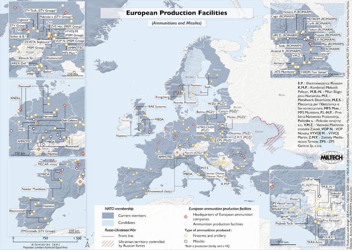 🗺🇺🇸🇪🇺 Карта: производственные мощности по выпуску боеприпасов и строительству ракет в Европе (основные заводы)
