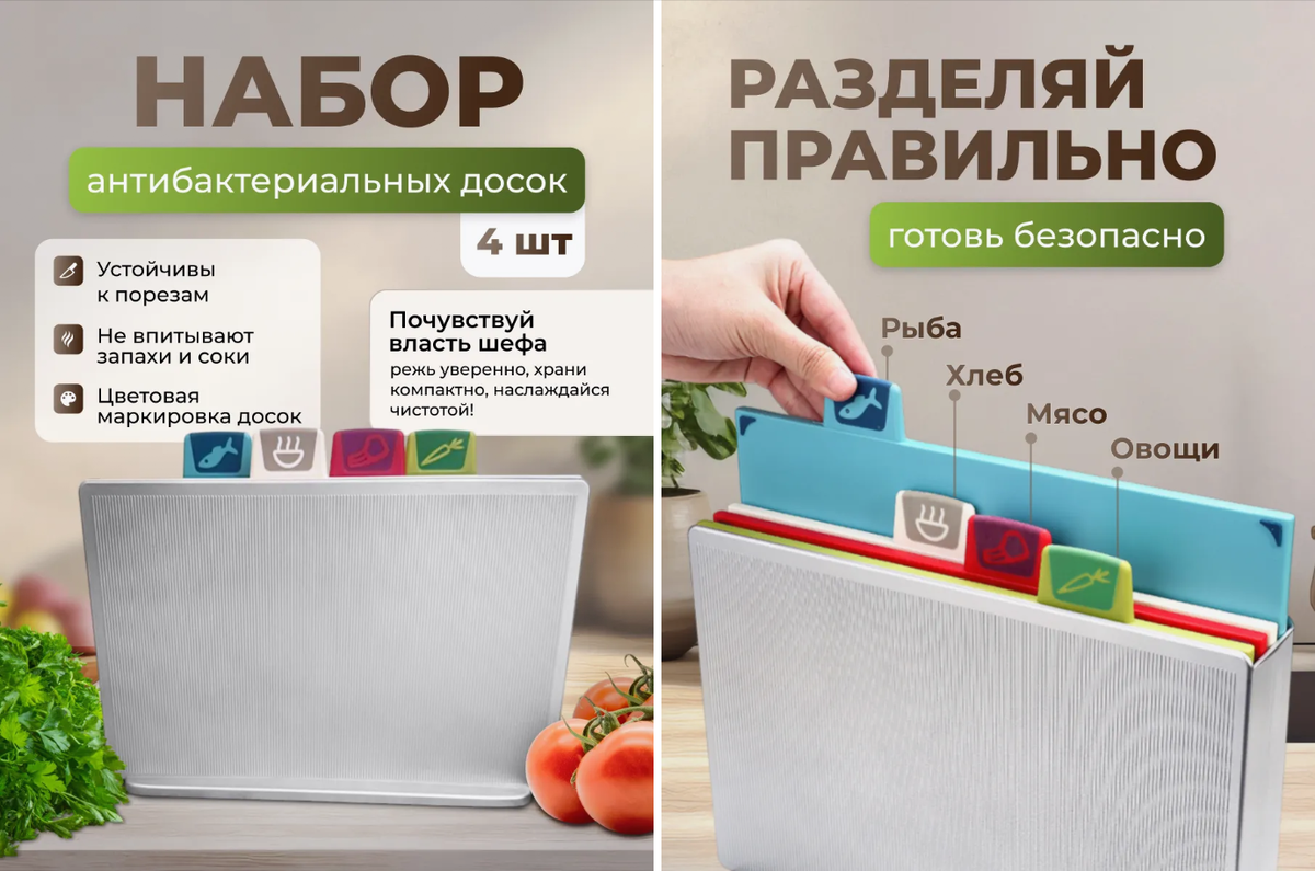 Начинаем наш наводящий порядок тур, конечно, с сердца дома — с кухни. Здесь, где рождаются кулинарные шедевры, важнее всего чистота. И этот набор антибактериальных досок — первый шаг к идеальной кухне. Четыре яркие доски, каждая со своим назначением (мясо, рыба, овощи, хлеб), стоят в аккуратной подставке. Никаких больше смешанных запахов и микробов!