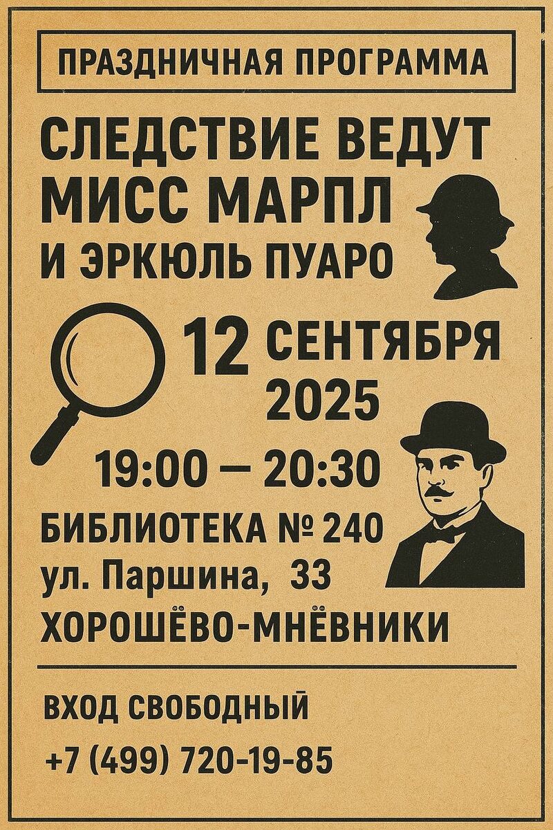 🔎✨ Следствие ведут мисс Марпл и Эркюль Пуаро ✨🔎 📅 12 сентября 2025 🕖 19:00 – 20:30 📍 Библиотека №240, ул. Паршина, 33 (Хорошёво-Мнёвники) К 135-летию со дня рождения королевы детектива Агаты Кристи библиотека приглашает на праздничную программу: 📖 Лекция «История детектива» – о жизни писательницы и развитии жанра. 🕵️ Квест «По следам преступника» – проверь свою логику и знания сюжетов Кристи. 📚 Презентация выставки «Криминальное чтиво» – лучшие зарубежные и отечественные детективы. 💡 Атмосфера тайн, загадок и блестящей дедукции гарантирована! 📌 Вход свободный | 👥 12+ ☎️ +7 (499) 720-19-85 🔗 Регистрация #библиотеки #гбукрылья #детективы #познавательныепрограммы #библиотека240 #хорошевомневники