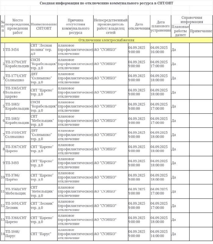 Информация по плановым отключениям в СНТ/ДНТ на 04.09.2025 от ЕДДС города Тюмени