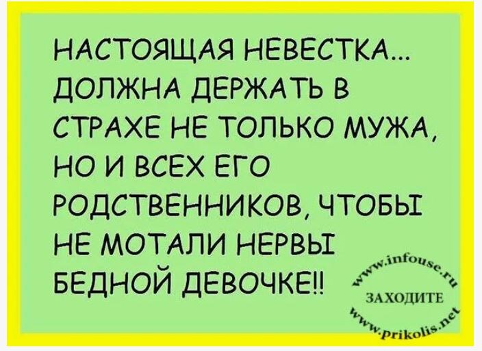 У моей свекровушки такая хорошая дочь получилась, что она даже в гости к ней не ходит, просто живет у нас и звонит ей по телефону, хотя от нас до доченьки 20 минут быстрым шагом. Вот же какая милая девочка уродилась! А больше всего меня бесит то, что свекровушка моя уже не знает на какой козе подъехать к своей доченьке, чтобы миленькой быть, а на сыночка своего болт забила в его лет 14, как раз с того момента, как Настенька родилась. И все бы ничего, но она на столько забила на него болт, что он в студенчестве страдал дистрофией и ложился в больницу чтобы покушать больничной еды на халяву! Вот этого я не могу понять и простить до сих пор! Вот такая у меня свекровушка. Я тоже не подарок, надо сказать, но если ко мне не лезть, то я вполне безобидная. А вот за мужа своего даже ей глотку перегрызу без зазрения совести, и она это знает. Зато сынок ее настолько любит, ценит и уважает, что она у него всегда № 1 в жизни, а я где-то на задворках. Я долго не могла это понять и смириться, но в какой-то момент мне просто стало на все пофиг. Горжусь собой безмерно!