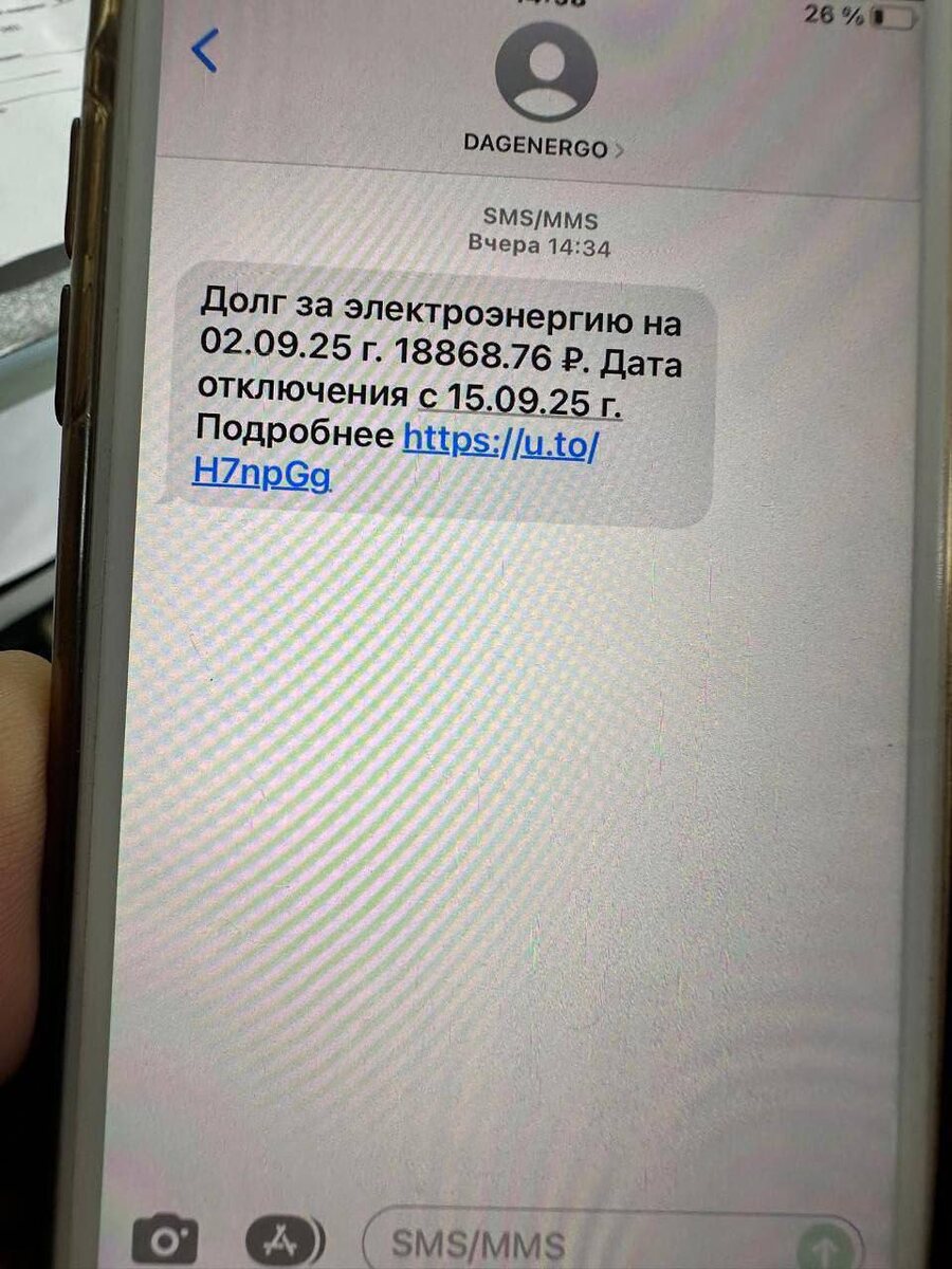 Дагестанцы стали получать подозрительные SMS-сообщения от отправителя DAGENERGO. В получаемых сообщениях содержится информация о якобы имеющейся задолженности за электроэнергию с указанием конкретной суммы и даты отключения – 15 сентября 2025 года, а также приводится подозрительная ссылка для получения более подробной информации. Как сообщили в «Дагэнерго», единственным официальным и доступным на сегодняшний день способом информирования абонентов являются уведомления, приходящие через Сбербанк Онлайн. 👉 ЧП Дагестан. Подписаться