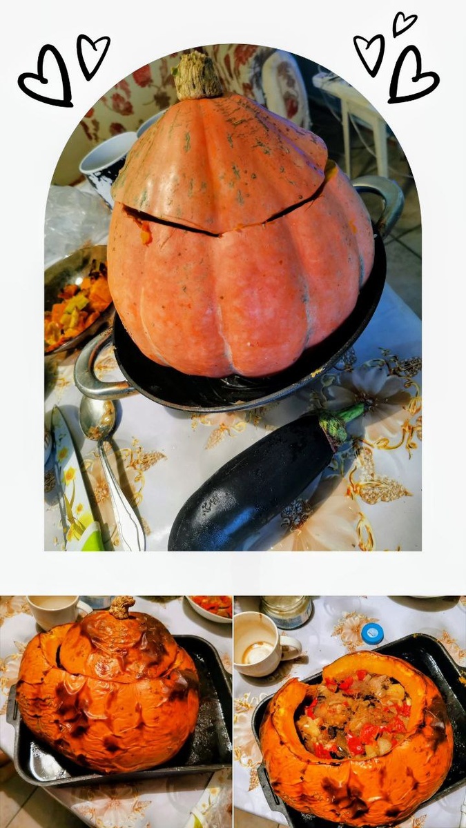 И снова сегодня героиня дня и осени 🍁 -Тыква. 🎃 Очень хороший вариант использовать тыкву и разнообразить меню - это овощное рагу с мясом в тыкве. Выбираем большую круглую тыкву,🎃 вырезаем верхушку-крышку, вынимаем осторожно семена. Овощи - картошку, морковь, лук и другие по вашему выбору- грибы, мясо заранее тушу до полуготовности, солю, перчу и в тыкву, её в духовку на часок. Главное, чтоб по размерам в высоту она влезла полностью с крышкой в духовку. Её помещаю в противень или любую форму, вниз в сам противень подливаю воду 4-5 см. Сама тыква даёт свой аромат, потом и по желанию можно с рагу её тоже набирать со стенок. Плюс здесь она играет роль горшочка. Так можно и маленькие тыковки взять и сделать всё то же самое, но получатся порционные горшочки-тыковки. Если никто не любит есть именно с тыквой, то рагу вынимаем из тыквы после духовки и остывания, её разрезаем на кусочки в холодильник, и постепенно добавлять можно в каши, в выпечку и т.п.