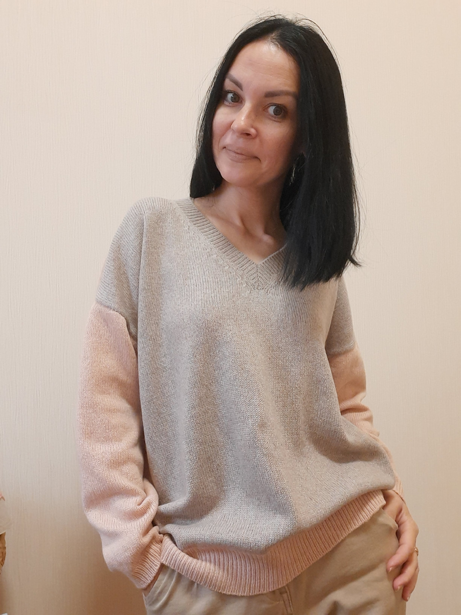 И снова, здравствуйте, друзья! Сегодня вам хочу представить этот шикарный пуловер, связанный из остатков 100% кашемира Coarsehair Loro Piana от прошлых проектов. Два изумительных оттенка, так классно сочетаются. Спинка дополнена полосками и кстати она удлиненная на высоту резинки. Спущенноп плечо, оптимальный V-образный вырез, нежнейшие цвета и какой красавчик получился, а весит всего 300гр, пряжа 550м/100гр. Поверьте, снимать не хочется! На етом пока все. До новых встреч! Пока, пока!!!