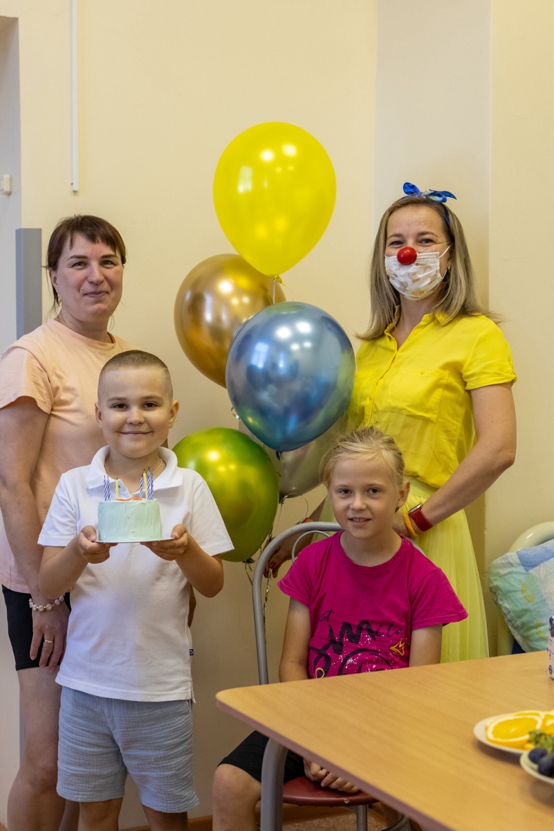 Поздравить именинника пришли больничные клоуны Мила и Буся из фонда имени Арины Тубис. Для Илюши подготовили подарки, воздушные шары и три торта, чтобы сбылось как можно больше желаний. Вместе с гостями мальчик задул свечи, нарисовал большую открытку и получил море добрых слов.