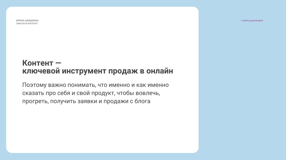 Как управлять вниманием аудитории? Что надо сказать человеку, чтобы он узнал себя в ваших словах и оставил заявку? Как составить продающий оффер, который выделит вас из толпы, поможет запомниться и привлечь клиентов на разных площадках. Когда заходите в соцсети для развития своего проекта, важно держать в голове мысль, что только вы управляете тем, какие люди подписываются на вас и покупают. ТОЛЬКО ВЫ независимо от площадки, управляете вниманием своей аудитории. Ваши текущие клиенты — это результат ваших действий или бездействий. На связи Ирина Шишкина, контент-маркетолог и смысловик. Более 6 лет работаю с контентом в разных нишах: от продвижения мясокомбината и антиквариата до психологов и художников. Помогаю экспертам создать продукт с чеком 20-40тыс и донести ценность себя и своего продукта, чтобы делать стабильные 1-2-3 продажи в месяц, уделяя соцсетям 10 часов в неделю. Вы сами формируете вокруг себя ассоциации, эмоции, мысли, которые в итоге влияют на желание людей подписаться, н
