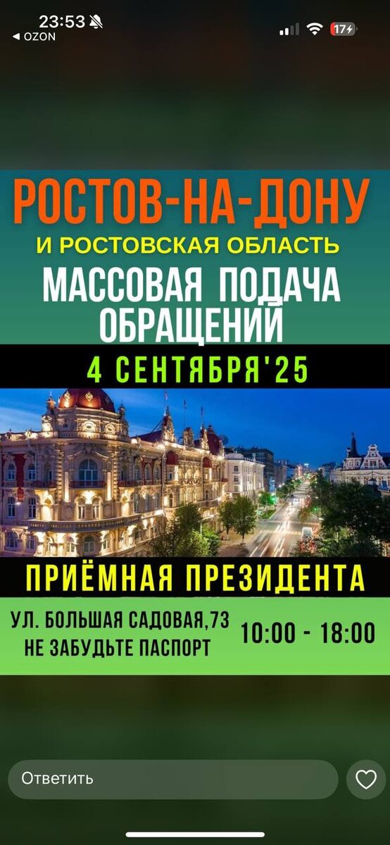 ВНИМАНИЕ 🔴🔴🔴 РОСТОВСКАЯ ОБЛАСТЬ ПРОТИВ ЗАПРЕТА НА КОРМЛЕНИЕ БЕЗДОМНЫХ ЖИВОТНЫХ, ПРОТИВ УБИЙСТВА ЖИВОТНЫХ, ПРОТИВ ЗООФАШИЗМА! ❗️Подача обращений в Приёмную Президента Российской Федерации в г. Ростове-на-Дону состоится в четверг ❗️4 сентября 2025 года ❗️по адресу: г Ростов ,Большая Садовая ул , 73. ❗️время: с 10.00 до 18:00. 🚨Это не акция, не митинг и не пикет. ❗️В шапке обращения добавьте ваши данные. В конце обращения добавьте дату подачи и подпись! ❗️Распечатайте текст в двух экземплярах или возьмите напечатанный бланк у дежурного на входе. ❗️Обязательно возьмите с собой паспорт и копию вашего обращения, на котором поставят печать с номером входящего! Проявите свою активную позицию! Приходите 04.09.2025 года, чтобы сказать своё НЕТ зоофашизму! 🟠 Сейчас вопрос стоит очень остро: или вы действуете и помогаете стране избежать падения в бездну расчеловечивания, или пассивно поддерживаете зоофашизм в России! Выбор за вами‼️ #Ростов #Россия #Путин #Зажизнь #ПротивЭвтаназии #Прот