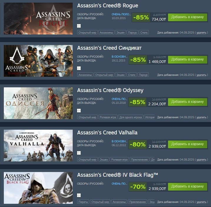 Серию игр Assassin's Creed в Steam можно урвать по большой скидке от 110 рублей: