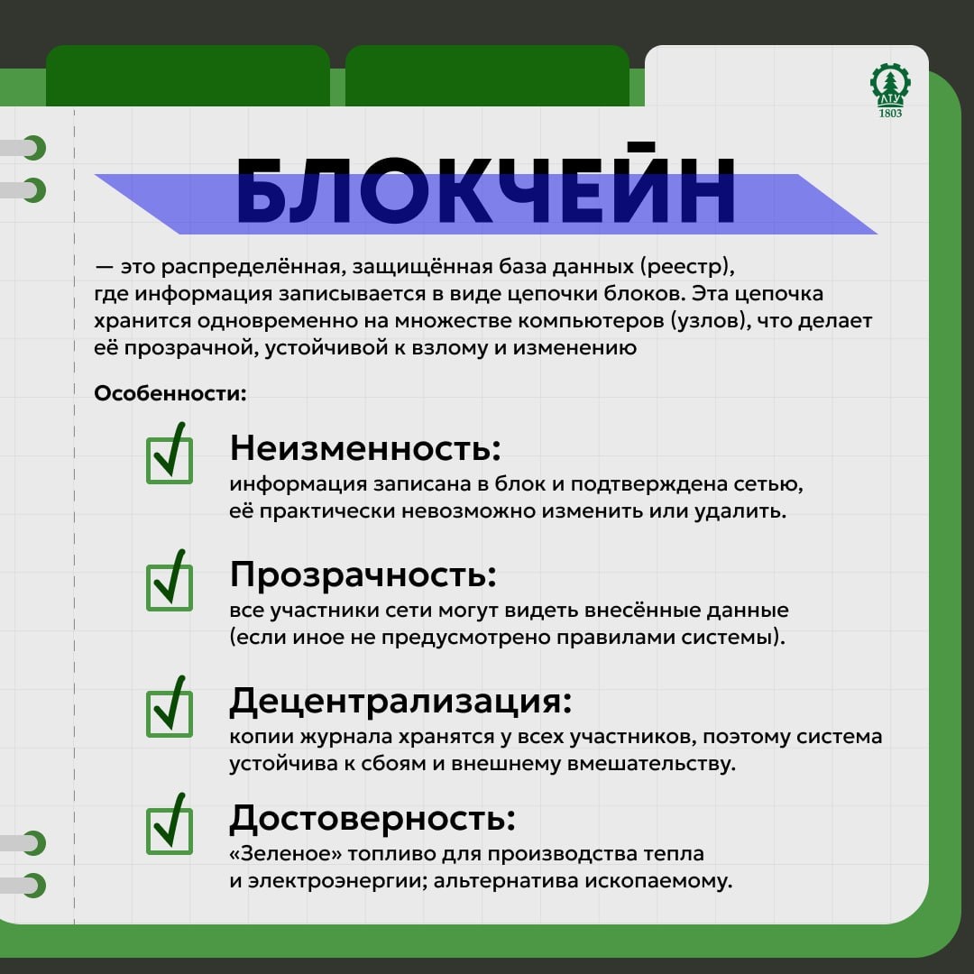 💡Добро пожаловать в рубрику «Глоссарий СПбГЛТУ»! И сегодня мы погрузимся в мир IT-технологий 🤓 💻 Когда мы говорим о блокчейне, чаще всего речь идет о распределенном реестре — то есть о базе данных, которая хранится не на одном сервере, а одновременно на тысячах компьютеров. Это не только криптовалюты, но и смарт-контракты, цифровые паспорта и прозрачные системы голосования. Надеемся, что теперь эти термины стали для вас чуточку яснее! В следующих выпусках нашего глоссария мы продолжим раскрывать интересные и важные понятия из мира СПбГЛТУ. Оставайтесь с нами ❤️ #глоссарийСПбГЛТУ