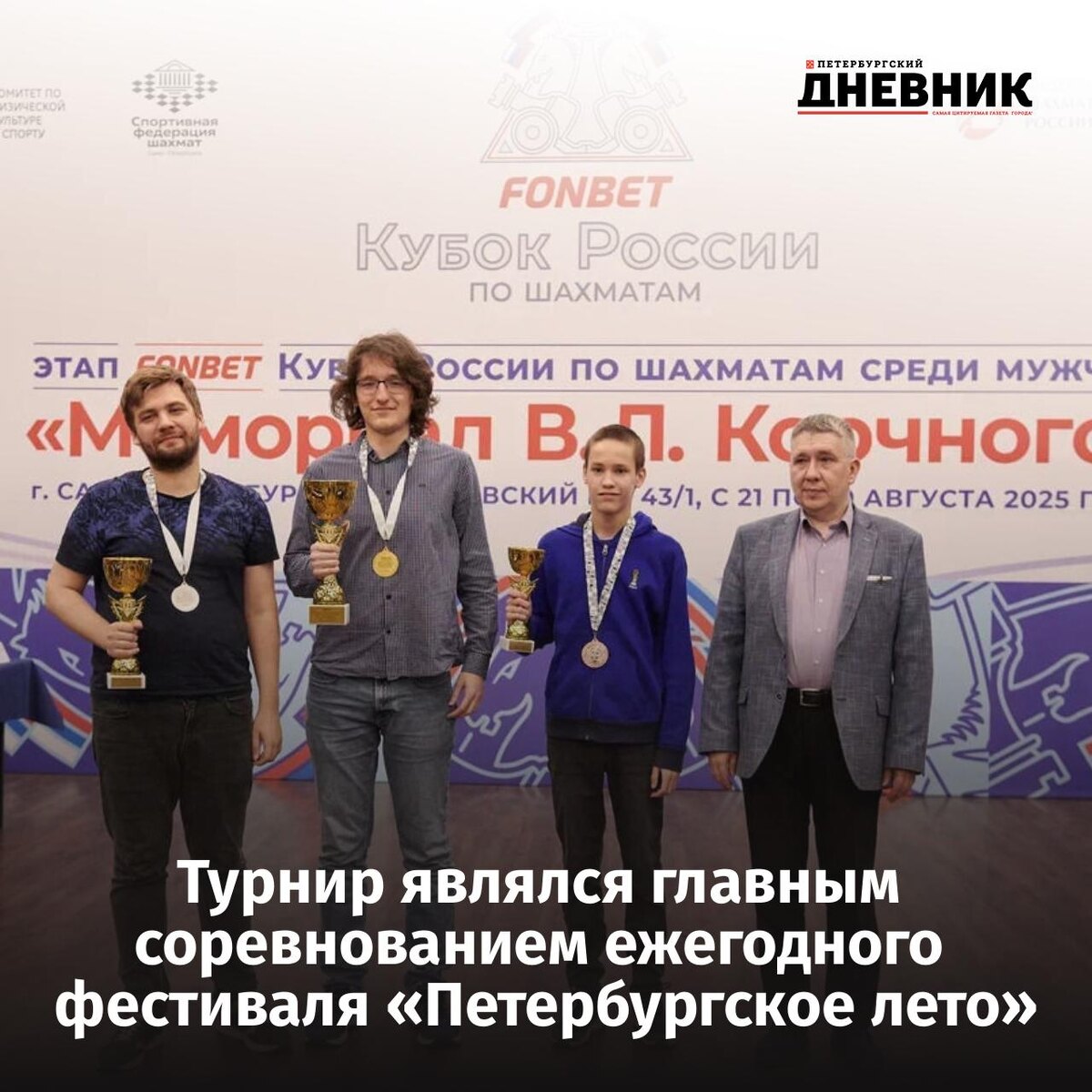 💫 В Санкт-Петербурге завершился этап Кубка России по шахматам среди мужчин «Мемориал В. Л. Корчного» В турнире приняли участие 233 спортсмена из девяти стран и 53 регионов РФ. По итогам девяти туров победу в соревновании одержал международный мастер, уроженец Петербурга Кирилл Шубин, в активе которого 7,5 очка. На втором месте оказался гроссмейстер из Москвы Владимир Захарцов, который уступил победителю турнира лишь по дополнительным показателям. Третьим призером стал мастер FIDE Александр Усов из Москвы, набравший 7 очков из 9 возможных. В рамках мероприятия провели соревнования по шахматам и среди детей, в которых приняли участие 423 юных спортсмена со всей России. Фото: предоставлено организаторами Петербургский дневник