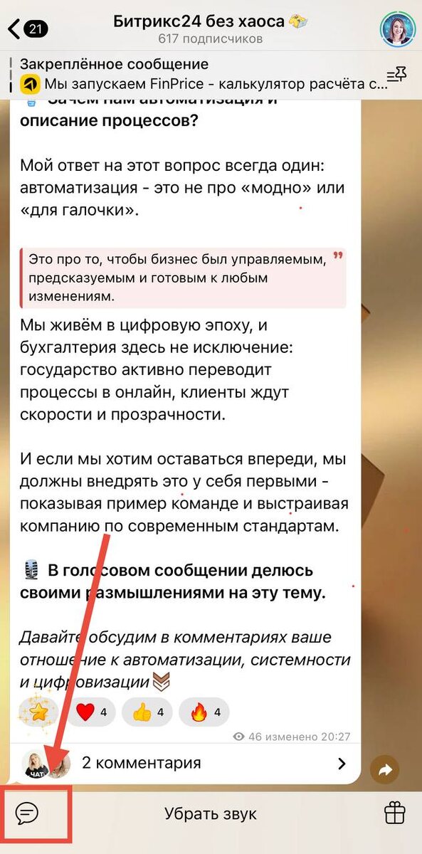 А вы знали что в моем канале можно писать мне сообщения?) Вот здесь внизу у вас должен отображаться значек чата. Нажимаете на него и можете писать мне свои вопросы / мысли / вообще пообщаться💬