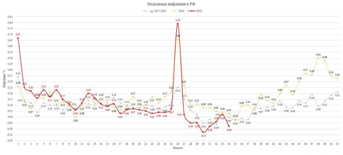 🗿 ДЕФЛЯЦИЯ ВНОВЬ ВЕРНУЛАСЬ! ЖДЁМ СНИЖЕНИЯ КЛЮЧА! ДЕФЛЯЦИЯ В РФ С 26 АВГУСТА ПО 1 СЕНТЯБРЯ СОСТАВИЛА 0,08% ПРОТИВ ИНФЛЯЦИИ НА УРОВНЕ 0,02% НЕДЕЛЕЙ РАНЕЕ - РОССТАТ ГОДОВАЯ ИНФЛЯЦИЯ В РФ НА 1 СЕНТЯБРЯ ЗАМЕДЛИЛАСЬ В РАЙОН 8,3%, СЛЕДУЕТ ИЗ ДАННЫХ РОССТАТА ☝️Данные как всегда отличные. Дефляция снова вернулась. Текущие недельные значения за последние полтора месяца сильно ниже среднеисторических значений в период с 2017-2024г, когда ставка была в несколько раз ниже. Ничего особо нового я не скажу - на следующей неделе в пятницу (заседание ЦБ) я жду снижения ставки до 16%, это мой основной сценарий. ❗️Рынок так же должен закладывать такой сценарий, именно поэтому на днях я ожидаю небольшой разгон всего рынка, ожидаем.