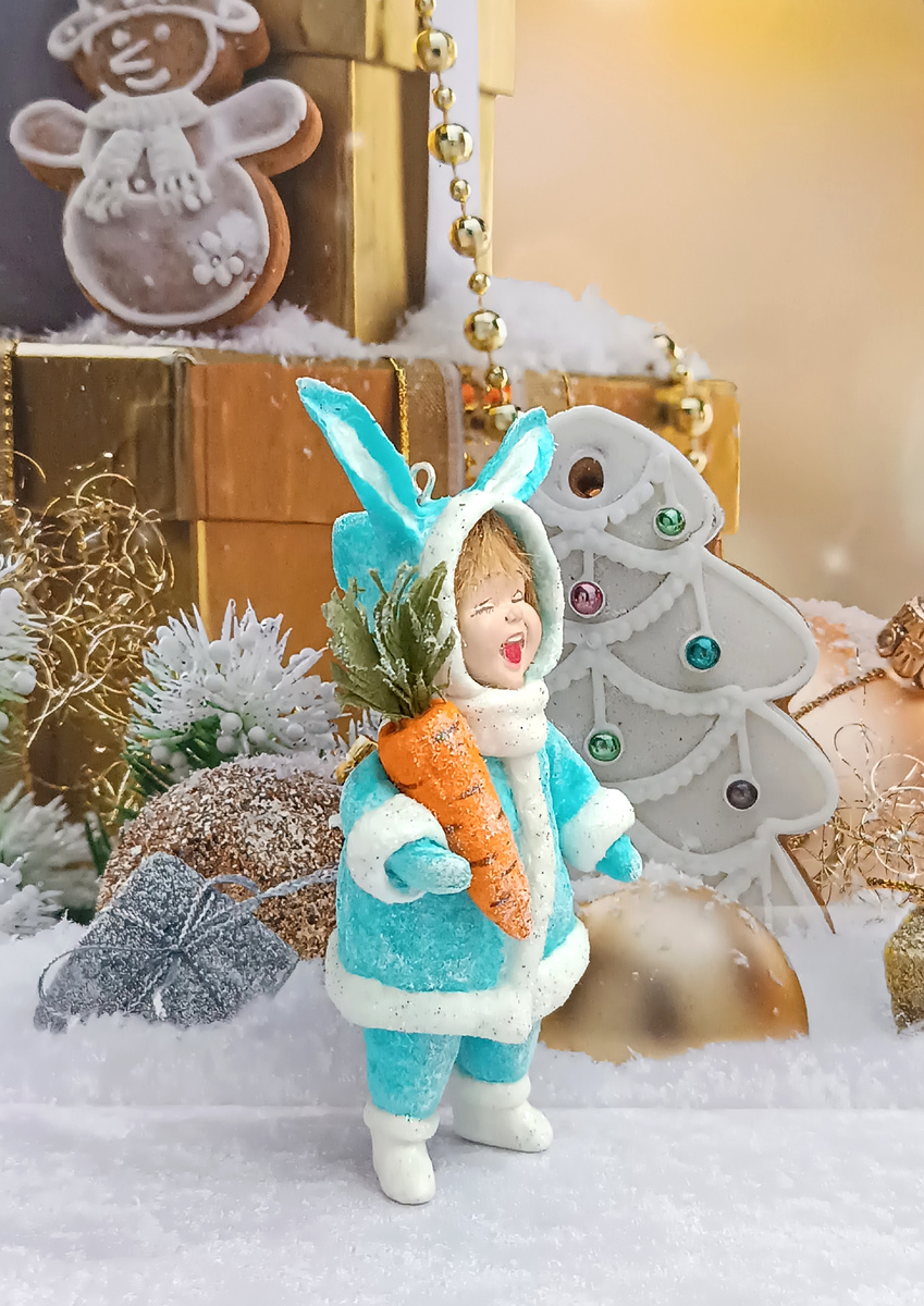 Приглашаю познакомиться с моим новым ватным малышом в костюме зайки! Делала я его специально для конкурса игрушек с морковками, который проводит рукодельное сообщество в ВК. Участниц много, работ представлено около сотни, поэтому мое участие там чисто спортивное, из интереса к теме))). Да и полюбоваться на идеи других конкурсанток очень увлекательно! Этот ватный зайка стал полезным для меня самой в плане оттачивания навыков выведения отдельных деталей игрушки. В частности, я снова сделала ножки, используя гипсовые заготовки. Мне очень нравится этот способ создания устойчивых стоп. Несмотря на то, что ватная игрушка - это прежде всего ёлочная подвеска, её возможность прочно стоять на поверхности так же важна. Всё чаще такие малыши становятся украшением интерьера к разным праздникам или же частью новогодних композиций. Начинала я осваивать"устойчивость" традиционно - сворачивая ножки из ваты и выравнивая стопы до тех пор, пока они не приобретут необходимую плоскость. Но это процесс длите