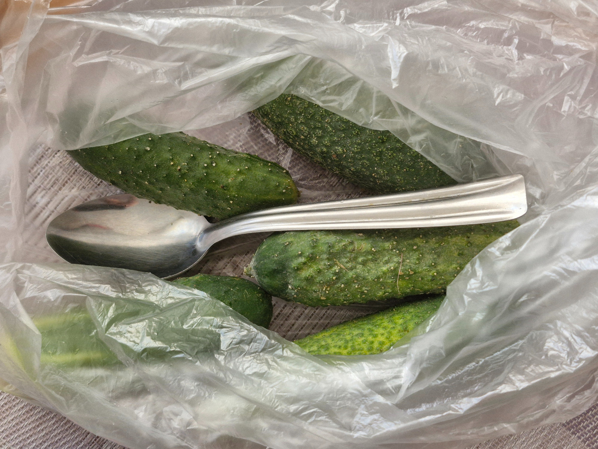Недавно увидела совет, как хранить дома огурцы, чтобы они остались хрустящие. Для этого нужно положить в пакет с огурцами пару обычных столовых ложек и всё. Пакет не завязывать. Ну, думаю, надо попробовать, тем более что огурцы лежат, а есть и перерабатывать я их не успеваю. И оказывается, этот совет работает! Огурцы, которое лежали в корзине, стали мягче. Огурцы в пакете с ложками остались твёрдым и хрустящими. Я не знаю как это работает 😁 Говорят дней десять так точно можно хранить. Длительно хранить так не буду, но неделю мне достаточно.