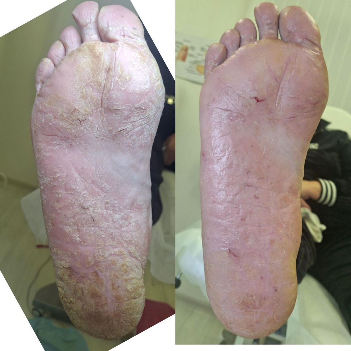 Начинаем большую работу по ладонно-подошвенной кератодермии.В помощь взяли sos- средство Podolab и крем-бальзам 35% мочевины Podolab.Все рекомендации даны.Будем уходить в ремиссию.Встреча через 14 дней.