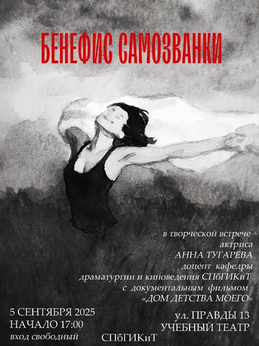 🎭5 сентября новый сезон в театре "По Правде" откроет "Бенефис самозванки" ☝🏻"Бенефис самозванки" – творческая встреча с актрисой Анной Тугаревой, доцентом кафедры драматургии и киноведения ГИКИТ. Мероприятие продолжит показ документального фильма "Дом детства моего" 🗓️Когда: 5 сентября в 17:00 📍Где: ГИКИТ, Правды 13, театр "По Правде" ⌛️ Длительность: 2 часа ☝🏻Возрастной рейтинг: 12+ ❗ВХОД СВОБОДНЫЙ по предварительной регистрации на сайте: https://info.gikit.ru/afisha/benefissamozvanki/view/336