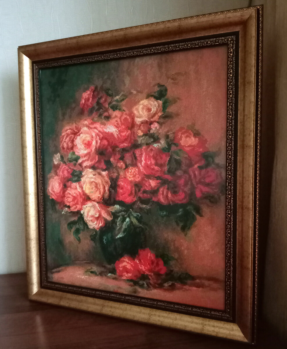 Всем привет! Я постоянно слежу за новинками своей любимой фирмы Риолис. Делаю обзор новинок, пишу статьи на эту тему. К сожалению, последние два года не вижу удачных разработок от этого производителя. Кажется, что дизайнеры выдохлись или ушли на заслуженный отдых. Возможно, новая команда не может создать что-то достойное. Могут быть другие причины. Раньше ведь были красивые Пейзажи. "Букет роз", "Васильки", были прекрасные серии - Города мира, разработки на черной канве, блэкворк, пейзажи, Сейчас остановить свой выбор не на чем. Может быть, я просто стала старше и не понимаю современных тенденций. В этой статье решила предаться воспоминаниям и сделать обзор своих вышитых работ по наборам ранее любимой мной фирмы. И так поехали... "Розовый гранат" вышивка была оформлена сначала в темную раму с обычным стеклом. Потом она была подарена внучке и переоформлена в другую раму с антибликовым стеклом. "Осенняя пора" картина подарена. Набор снят с производства. Название набора не п