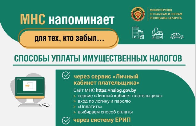 📣 Уважаемые налогоплательщики! 📃 Налоговые уведомления об уплате имущественных налогов отправляются по адресу вашей регистрации или в ваш личный кабинет налогоплательщика. ➡️ Если вы не проживаете по месту регистрации и не можете получить уведомление, узнать сумму имущественного налога можно: ✅ В личном кабинете налогоплательщика в разделе «Информация о суммах налогов». ✅ В системе ЕРИП, выбрав налоговый орган по месту регистрации и указав свой УНП. 🖥 Подписывайся на наши соцсети: 💬 VK / 📹YouTube / 📺RuTube / 📱 Instagram / 📱 TikTok