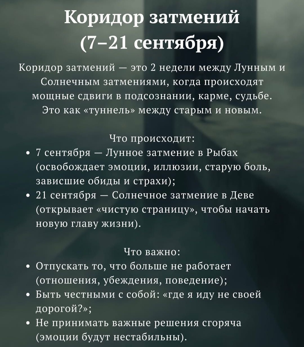 Дорогие, скоро наступит необыкновенное время — коридор затмений, с 7 по 21 сентября. Представь: за окном кружатся золотые листья, а на небесах рождается что-то новое — и ты, как и вся Вселенная, будто входишь в особый портал перемен. В такие дни особенно хочется укутаться в мягкий плед, зажечь свечу, обнять себя изнутри и разрешить себе слушать внутренний голос, даже если он звучит совсем необычно. Этот коридор — не про страх, а про пробуждение. Твои мечты могут неожиданно обостриться, а старые сценарии — показаться снова. Всё, что прячась в уголках души, выходит на свет: чтобы ты могла встретить это с заботой, отпустить и освободить место для тепла и обновления. Волшебство в том, чтобы не спешить — просто быть, наблюдать, греть руки о чашку чая и прощаться с ненужным, улыбаясь каждой перемене как верному гостю. ✨ Пусть этот коридор затмений станет порталом в твою новую реальность — где ты нежно относишься к себе, прощаешь себе прошлое, принимаешь будущее с благодарностью и верой в сво