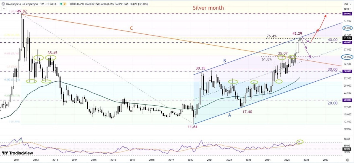На месячном графике фьючерсов на серебро видно, что после максимумов 2011г, когда котировки немного недотянули до уровня 50.00 $ за унцию цены резко полетели вниз, потеряв более 40%. Новая волна распродаж пришлась на 2013-2015гг, после чего драгметалл стабилизировался в диапазоне 12.00-20.00, но пандемия развернула котировки вверх. С 2020г сформировался широкий восходящий канал «А-В», правда в качестве основного сильного сопротивления выступила круглая цифра 30.00. В прошлом году быки продавили этот важный уровень, достигнув отметки 35.07, а в качестве сопротивления выступил уровень 61.8% коррекции от всего падения 49.82-11.64. Летом этого года цена сначала пробила линию сопротивления «С», после чего рост ускорился и на прошлой неделе была протестирована круглая цифра 40.00. Вчера цена достигла отмтеки 42.29, где проходит уровень 76.4% коррекции. Есть вероятность, что цена может уйти на коррекцию, вплоть до уровня 35.00. Но если отметка 40.00 удержил цены, то можно ожилать нового роста до 45.00 и выше.