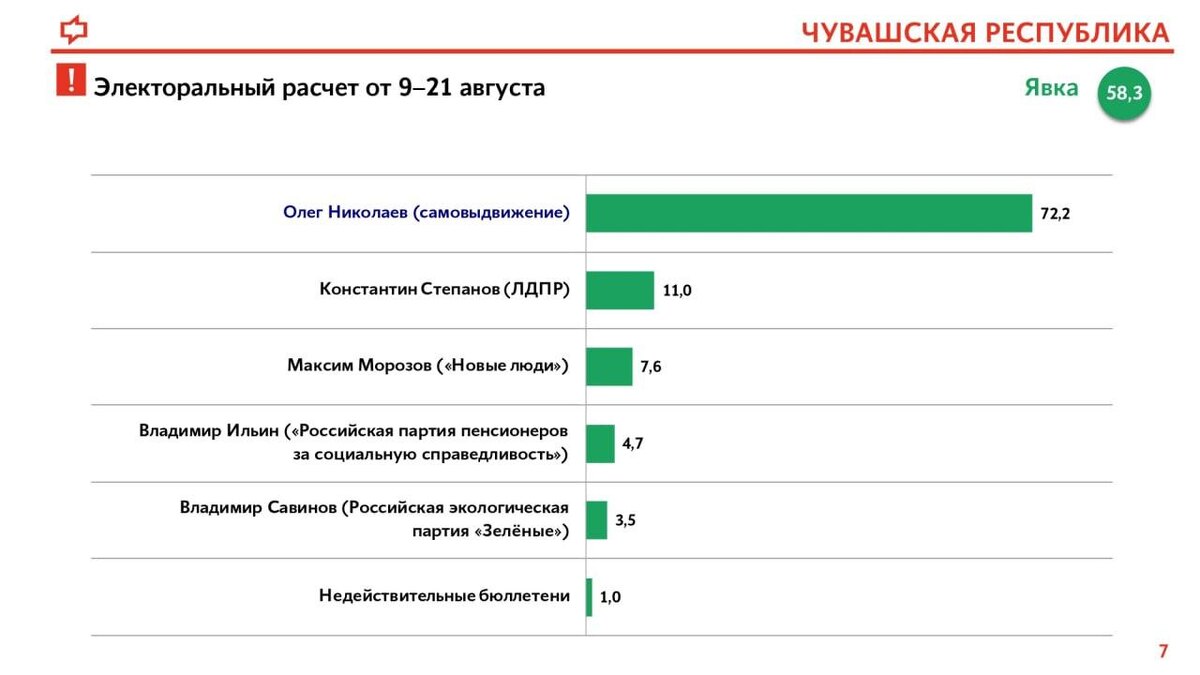 Опрос жителей Чувашии показал, что Олег Николаев получит на выборах 72,2% 12-14 сентября состоится единый день голосования в регионах страны. В преддверии выборов ведущие социологические и аналитические агентства России провели круглый стол на тему: «Единый день голосования - 2025: на финишной прямой». Руководитель группы партнерских коммуникаций Фонда "Общественное мнение" Роман Бумагин проанализировал электоральные предпочтения жителей 6 регионов России, в том числе и Чувашии. Согласно опросу Фонда за действующего главу региона Олега Николаева готовы отдать голос 72,2% опрошенных, на втором месте (11 %) – Константин Степанов (ЛДПР), замыкает тройку Максим Морозов («Новые люди») – 7,6%. Эксперты отметили высокую прогнозируемую явку (почти 60%) по сравнению с другими регионами, а также то, что действующий глава получает высокий процент благодаря поддержке Президента и позитивным изменениям в Республике за 5 лет работы. Фонд "Общественное мнение» (ФОМ) — ведущая социологическая
