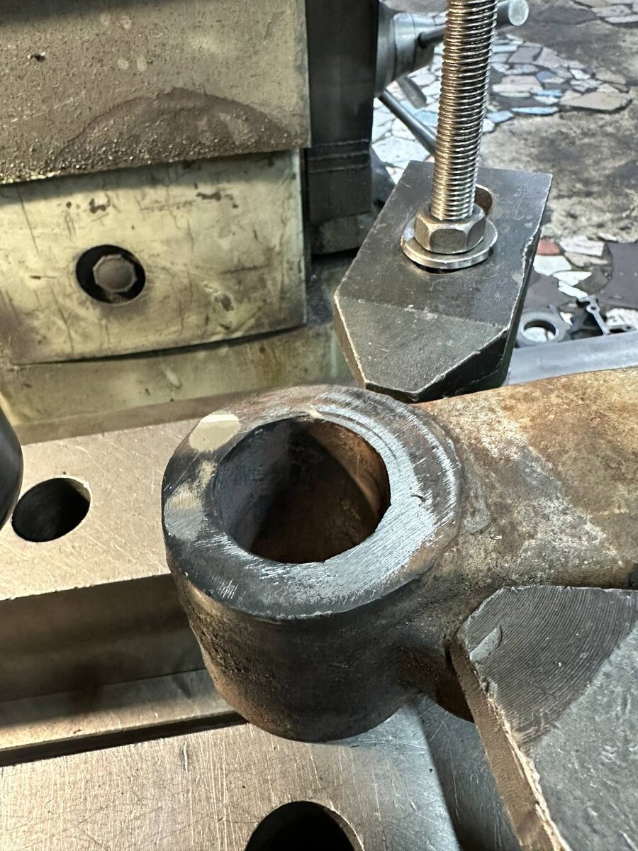 Восстановление балки шакман. Привезли переднюю балку с грузового автомобиля шакман. Нужно восстановить с одной стороны посадочное место под шкворень. 1. Выставляю на станок, центрую, и растачиваю посадку под втулку. Делаю так, чтобы втулка была со стенкой 6мм. Палец - ф50,00 Втулка - ф62,00 Упор нижний, втулка с запасом по длине, для обнижения. Фото 1, 2, 3 - как было (ДО). Фото 4 - шкворень. Фото 5 - чертеж втулки, для заказа токарю. Пока токарь делает втулку, планирую плоскость, чтобы была ровной. (Фото 6). После ждем втулку и будем дальше продолжать работу. После готовности выложу пост. #втулка #шакман #шкворень